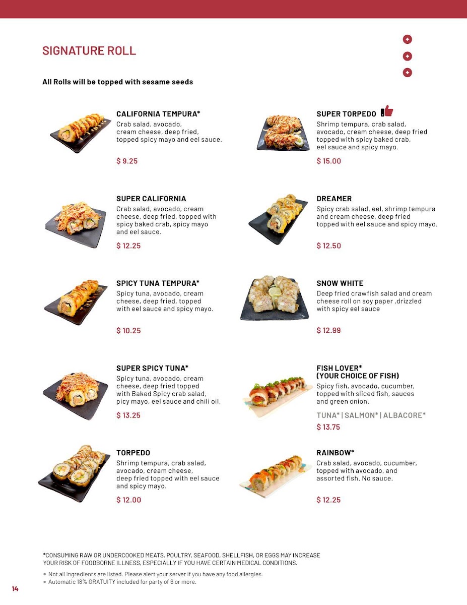 Spicy crab salad and shrimp tempura roll topped with Immitation crab with our special Sauce.