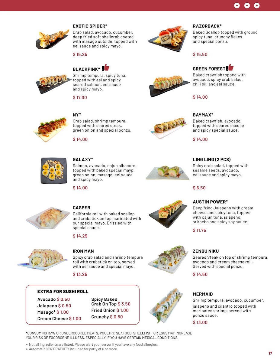 Baked Salmon and avocado roll topped with Cajun albacore. baked with special mayonnaise topped with green onion and masago. comes with special sauce.