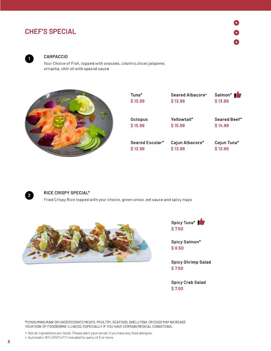 Deep fried Sushi rice topped with Mixed Shrimp and spicy crab salad, Avocado, green onion and masago. served with Special Sauce.